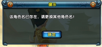 4、如果角色名字已经被别人先抢注了,系统会出现提示框如下,这样只得再想个别的名字喽。