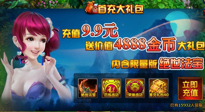 服务器开启后,玩家只要充值99金币(9.9元)即可获得价值4888金币的游戏道具!内含限量版绝世法宝,大量的历练战功、荣誉战功,更有首充礼包助你升到100级! |