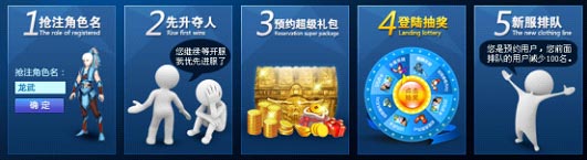 1、预约服务器名字:雄霸天下、千秋霸业 注:服务器为双线服务器,电信、网通线路通用 2、活动规则: A、所有玩家均可参与本次预约活动。 B、预约流程:注册账号,下载游戏客户端→登录游戏,选择预约服务器,填写手机号码→ 创建角色完成预约→享受预约好礼,开服特权。 C、凡是在2013年7月15日—18日24:00内进行角色预约的玩家,开服登录游戏后,均可获得预约超级礼包,更有抽奖等你来。 D、温馨提示:同一账号下不同区的角色需要分别预约,今日14:00服务器正式开启后,预约角色才能进入游戏。 3、五大特权服务: ![]() 更多详情见预约新服 畅享五大特权专题,传送门:http://lw.q1.com/huodong/yzc.html |