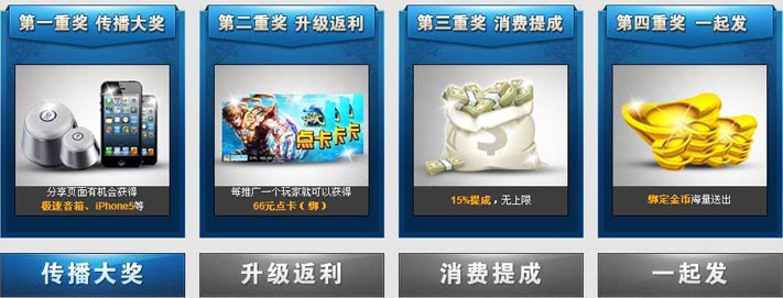 第一重传播大奖:极速音箱、iphone5等 第二重升级返利:每推广一个玩家可以获得66元点卡(绑) 第三重消费提成:15%提成,无上限! 第四重一起发:持续绑定金币奖励! 更多详情见邀请好友玩龙武专题,传送门:http://lw.q1.com/tg/index.html |